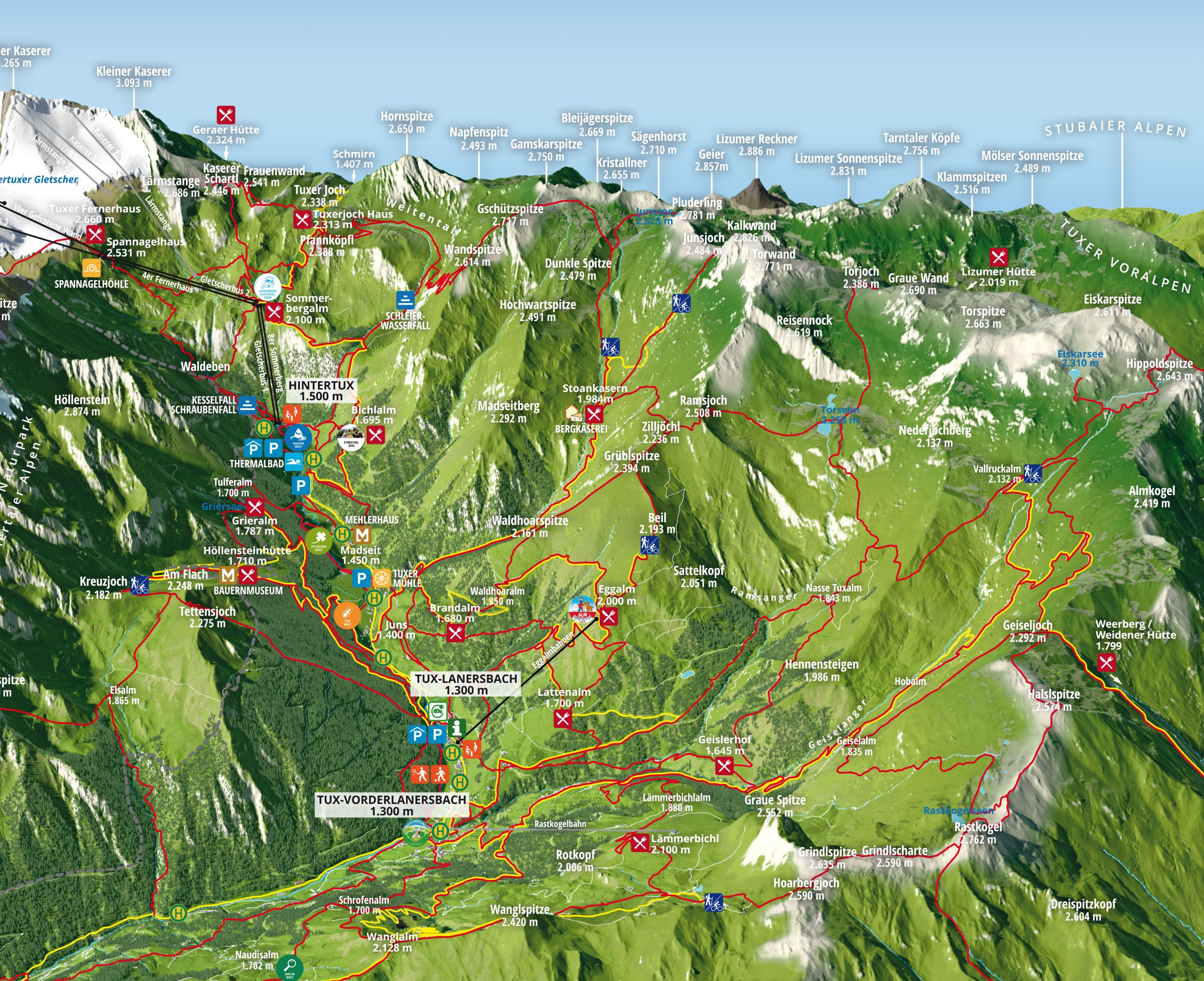 In Tux starten talloze wandelroutes vanaf de Hintertuxer Gletscherbahn en Eggalmbahn. Gezinnen kiezen vaak voor de tocht naar de Bichlalm (1,5 uur). Wie meer uitdaging zoekt kan de Tuxer Höhenweg (3:30 uur) of de panoramische route naar de Torsee (4 uur) lopen. Voor iedere wandelaar is er een perfecte route.